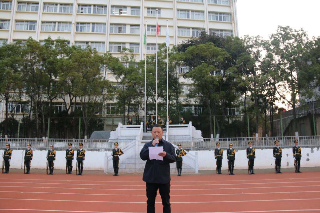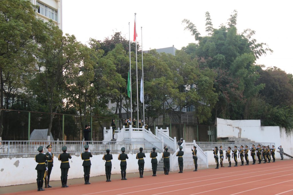 “齐步——走!”一声令下,国旗仪仗队的护旗手迈着整齐划一的步伐护送国旗至升旗台,全体师生行注目礼迎接国旗。伴随着国歌的奏响,五星红旗冉冉升起,在晨曦中迎风飘扬。